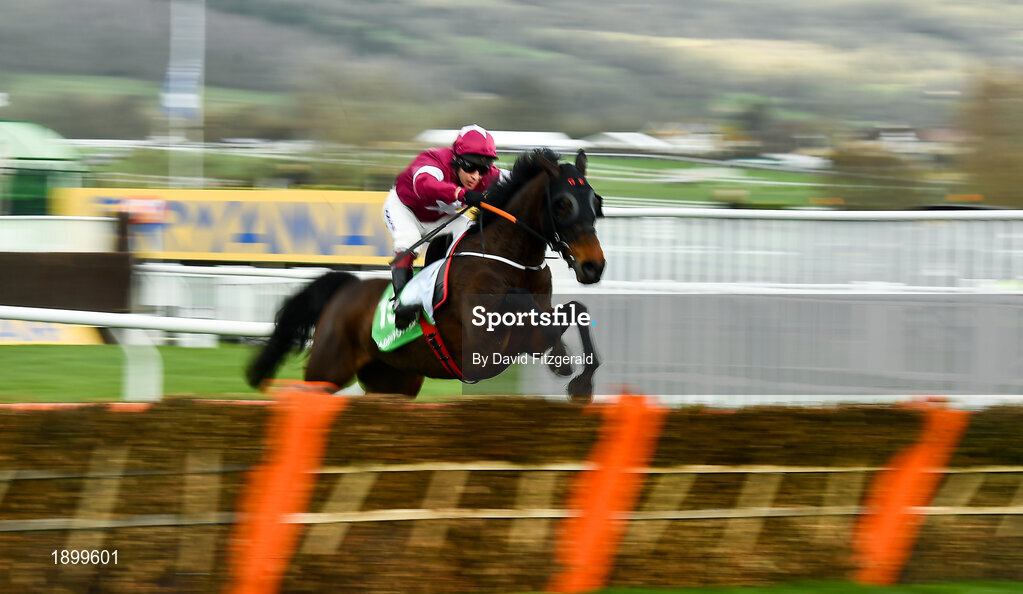 12 March 2020; Apple's Jade, with Richard Johnson up, jump the last, first time round, during the Paddy Power Stayers' Hurdle on Day Three of the Cheltenham Racing Festival at Prestbury Park in Cheltenham, England. Photo by David Fitzgerald/Sportsfile