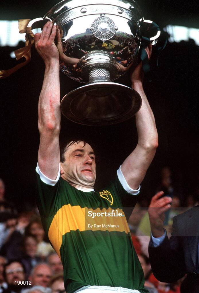 21 September 1986; Kerry captain Tommy Doyle lifts the Sam Maguire Cup after his side victory in the All-Ireland Senior Football Championship final between Kerry and Tyrone in Croke Park, Dublin. Photo by Ray McManus/Sportsfile