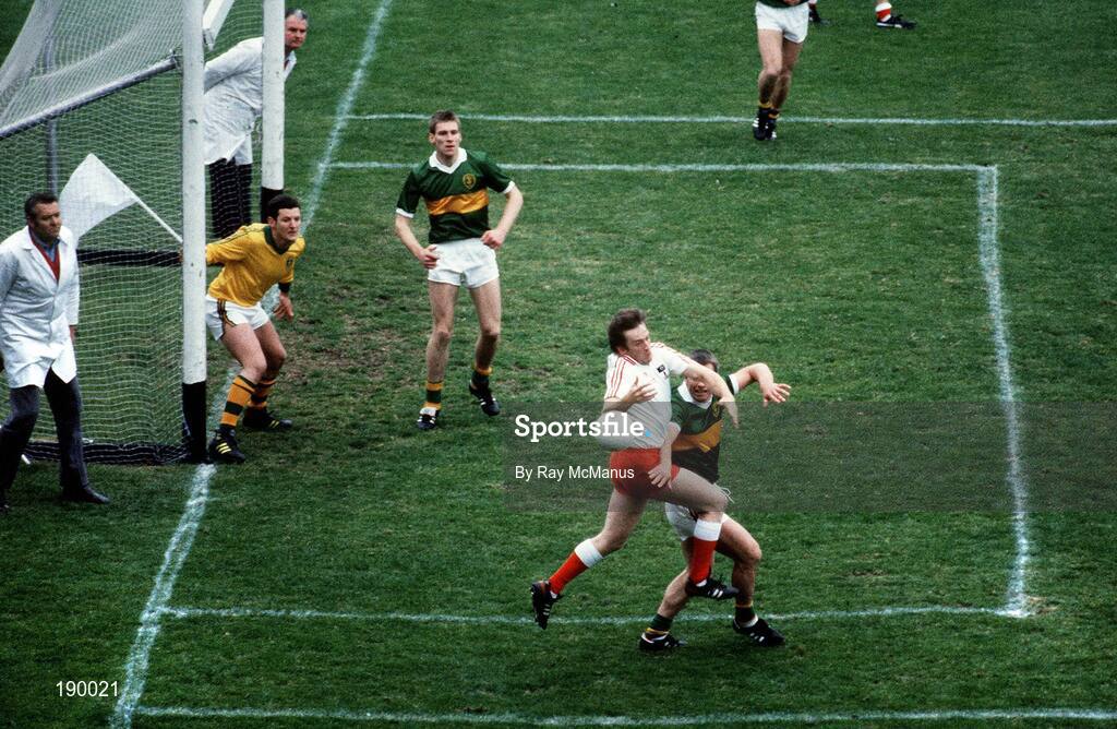 21 September 1986; Paudge Quinn of Tyrone contests possession with Paidi O Se of Kerry, as Tom Spillane of Kerry and goalkeeper Charlie Nelligan look on, during the All-Ireland Senior Football Championship final in Croke Park, Dublin. Photo by Ray McManus/Sportsfile