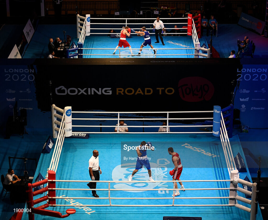 16 March 2020; A general view of the action from Ring A and Ring B on Day Three of the Road to Tokyo European Boxing Olympic Qualifying Event at Copper Box Arena in Queen Elizabeth Olympic Park, London, England. Photo by Harry Murphy/Sportsfile
