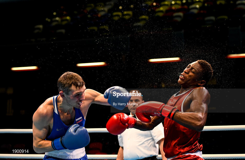 16 March 2020; Youba Sissokho Ndiaye of Spain, right, and Andrei Zamkovoi of Russia during their Men's Welterweight 69KG Preliminary round bout on Day Three of the Road to Tokyo European Boxing Olympic Qualifying Event at Copper Box Arena in Queen Elizabeth Olympic Park, London, England. Photo by Harry Murphy/Sportsfile