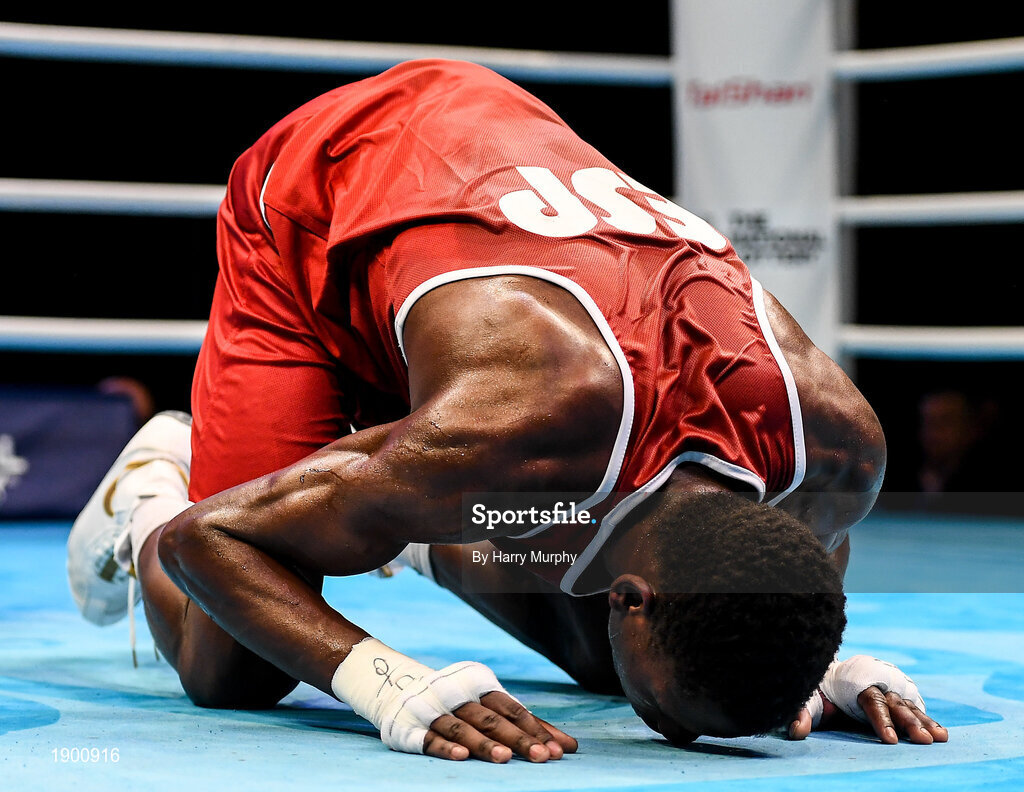 16 March 2020; Youba Sissokho Ndiaye of Spain reacts following his defeat to Russia following their Men's Welterweight 69KG Preliminary round bout on Day Three of the Road to Tokyo European Boxing Olympic Qualifying Event at Copper Box Arena in Queen Elizabeth Olympic Park, London, England. Photo by Harry Murphy/Sportsfile