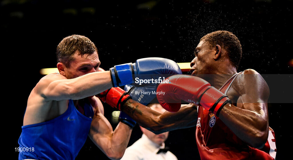 16 March 2020; Youba Sissokho Ndiaye of Spain, right, and Andrei Zamkovoi of Russia during their Men's Welterweight 69KG Preliminary round bout on Day Three of the Road to Tokyo European Boxing Olympic Qualifying Event at Copper Box Arena in Queen Elizabeth Olympic Park, London, England. Photo by Harry Murphy/Sportsfile