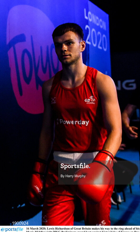 16 March 2020; Lewis Richardson of Great Britain makes his way to the ring ahead of his Men's Middleweight 75KG Preliminary round bout against Victor Yoka of France on Day Three of the Road to Tokyo European Boxing Olympic Qualifying Event at Copper Box Arena in Queen Elizabeth Olympic Park, London, England. Photo by Harry Murphy/Sportsfile
