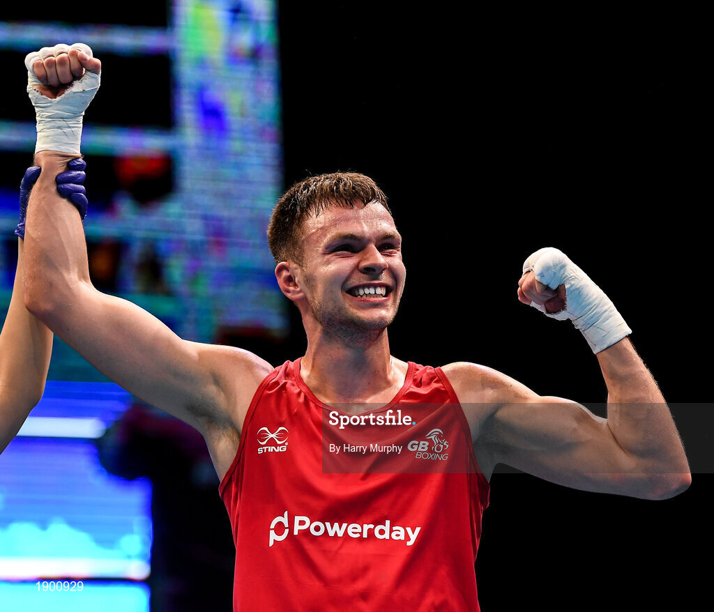16 March 2020; Lewis Richardson of Great Britain is declared victorious after defeating Victor Yoka of France following their Men's Middleweight 75KG Preliminary round bout on Day Three of the Road to Tokyo European Boxing Olympic Qualifying Event at Copper Box Arena in Queen Elizabeth Olympic Park, London, England. Photo by Harry Murphy/Sportsfile