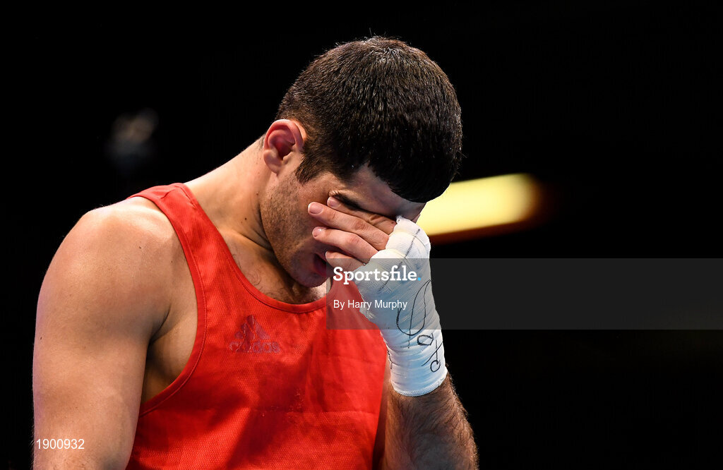 16 March 2020; Kamran Shakhsuvarly of Azerbaijan reacts following his defeat to Oleksandr Khyzhnaik of Ukraine following their Men's Middleweight 75KG Preliminary round bout on Day Three of the Road to Tokyo European Boxing Olympic Qualifying Event at Copper Box Arena in Queen Elizabeth Olympic Park, London, England. Photo by Harry Murphy/Sportsfile
