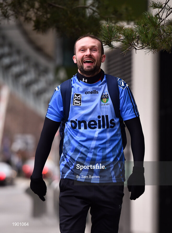 18 March 2020; Glenavon footballer Conan Byrne, formerly of UCD, Sporting Fingal, Shelbourne and St Patrick's Athletic, arrives at the Aviva Stadium during his marathon walk in aid of the Irish Cancer Society which took in every SSE Airtricity League of Ireland stadium in the Dublin region and which started off in Tolka Park and finished at the Aviva Stadium. Photo by Sam Barnes/Sportsfile