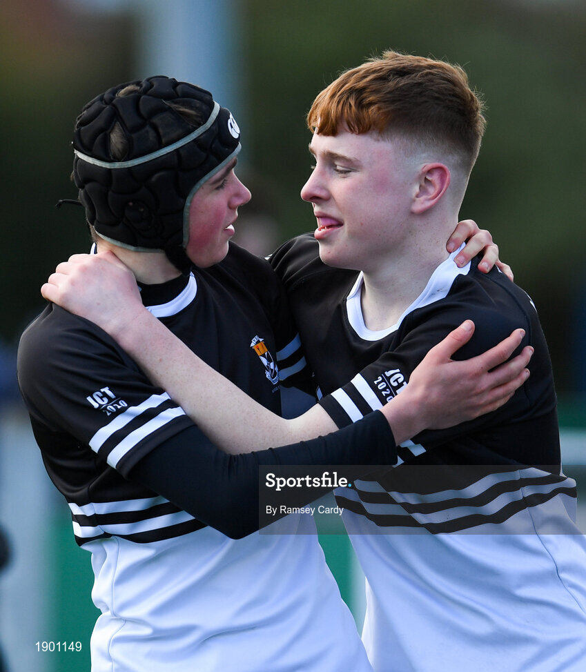 10 March 2020; Hugh Hamilton, left, and John Sheedy of Newbridge College celebrate following the Bank of Ireland Leinster Schools Junior Cup Semi-Final match between Terenure College and Newbridge College at Energia Park in Donnybrook, Dublin. Photo by Ramsey Cardy/Sportsfile