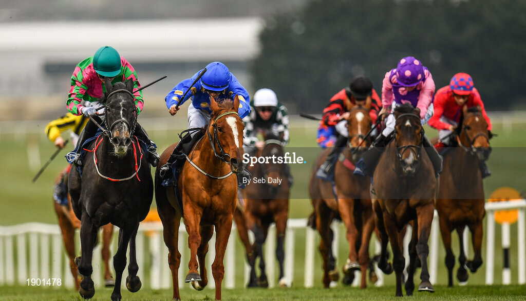 23 March 2020; In From The Cold, left, with Chris Hayes up, races alongside eventual second place Camachita, with Danny Sheehy up, on their way to winning the Naas Racecourse Business Club Madrid Handicap at Naas Racecourse in Naas, Co Kildare. Photo by Seb Daly/Sportsfile