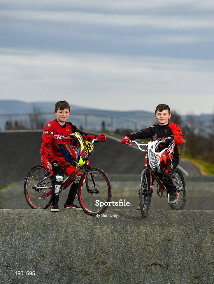 25 March 2020; 2019 Male 9-10 BMX Ireland Champion Malachy O’Reilly, age 10, from Finglas, Dublin, left, and 2019 BMX World Challenge U8 Boys Finalist, UK and Leinster No1 and All-Ireland 2019 Champion Evan ‘The Bullet’ Bartley, age 9, from Clonee, Co Dublin, pose for a portrait during a Lucan BMX Club feature, at Lucan BMX track, Dublin. Photo by Seb Daly/Sportsfile