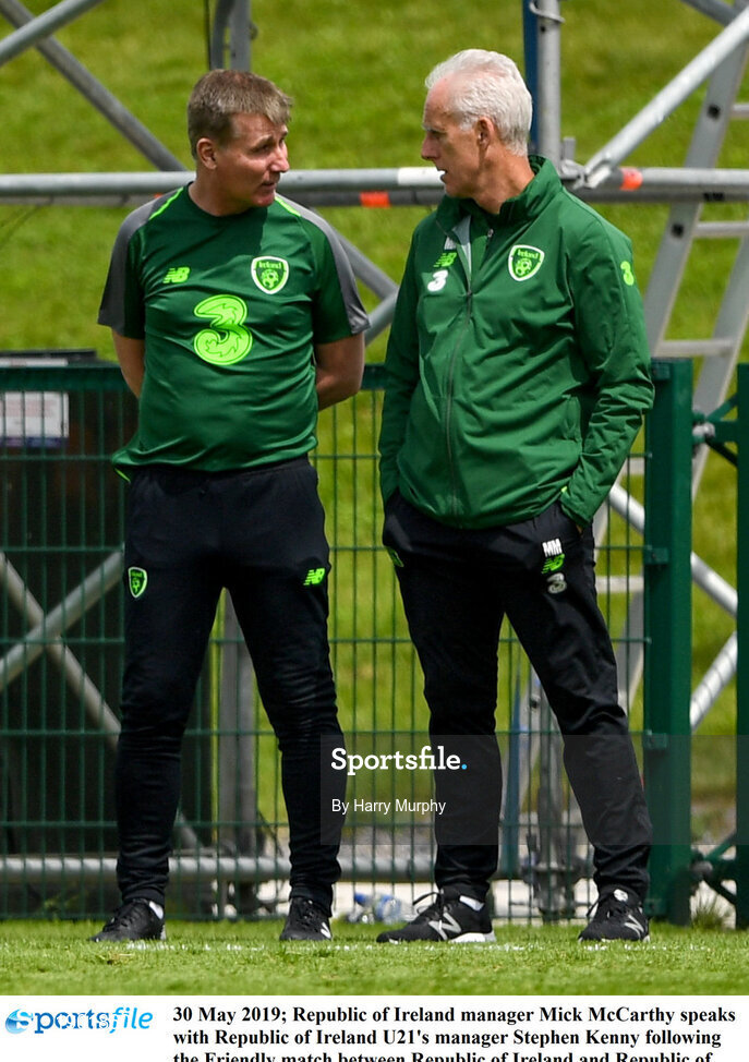 30 May 2019; Republic of Ireland manager Mick McCarthy speaks with Republic of Ireland U21's manager Stephen Kenny following the Friendly match between Republic of Ireland and Republic of Ireland U21's at the FAI National Training Centre in Dublin. Photo by Harry Murphy/Sportsfile