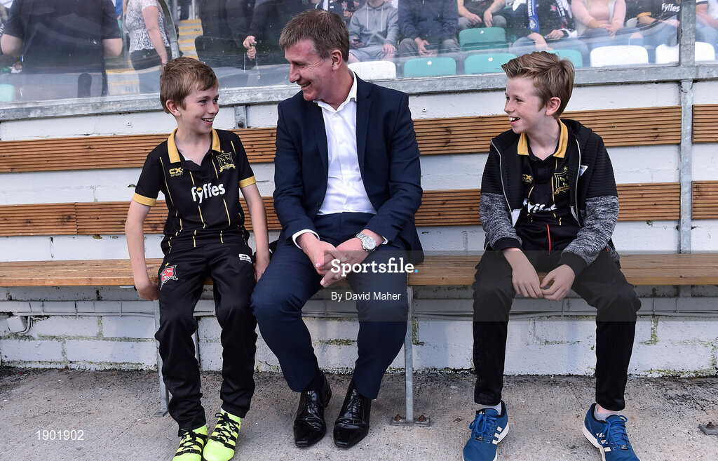 2 August 2016; Dundalk manager Stephen Kenny with his two sons, Eoin, left, age 10, and Fionn, age 12, prior to the UEFA Champions League Third Qualifying Round 2nd Leg match between Dundalk and BATE Borisov at Tallaght Stadium in Tallaght, Co. Dublin. Photo by David Maher/Sportsfile