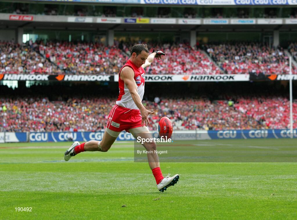 24 September 2005; Tadhg Kennelly, Sydney Swans, kicks a goal against the West Coast Eagles. AFL Grand Final, Sydney Swans v West Coast Eagles, Melbourne Cricket Ground, Melbourne, Australia. Picture credit; Kevin Nugent / SPORTSFILE