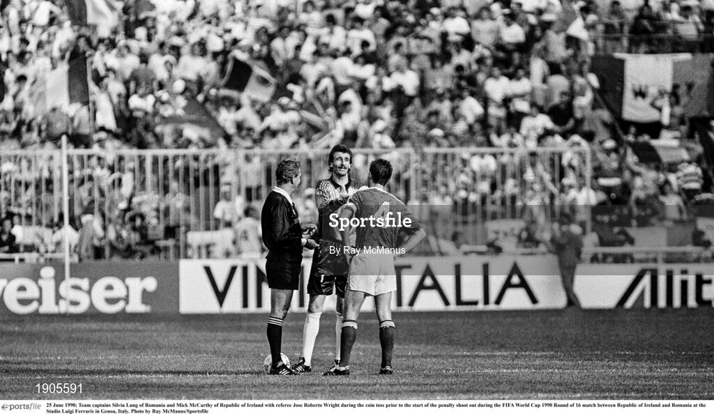 25 June 1990; Team captains Silviu Lung of Romania and Mick McCarthy of Republic of Ireland with referee Jose Roberto Wright during the coin toss prior to the start of the penalty shoot out during the FIFA World Cup 1990 Round of 16 match between Republic of Ireland and Romania at the Stadio Luigi Ferraris in Genoa, Italy. Photo by Ray McManus/Sportsfile