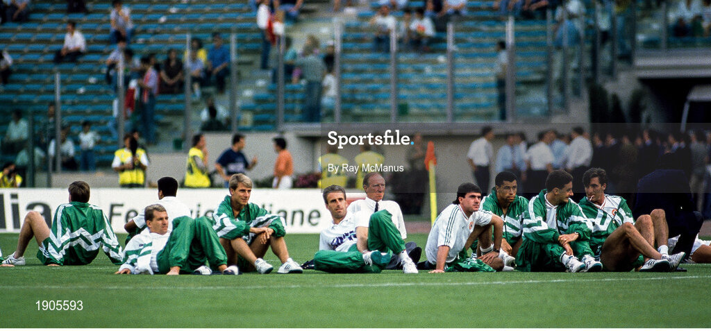 25 June 1990; Republic of Ireland manager Jack Charlton and players, from left, Chris Morris, David Kelly, Mick McCarthy, Alan McLoughlin, Paul McGrath, John Aldridge and Bernie Slaven prior to the FIFA World Cup 1990 Round of 16 match between Republic of Ireland and Romania at the Stadio Luigi Ferraris in Genoa, Italy. Photo by Ray McManus/Sportsfile