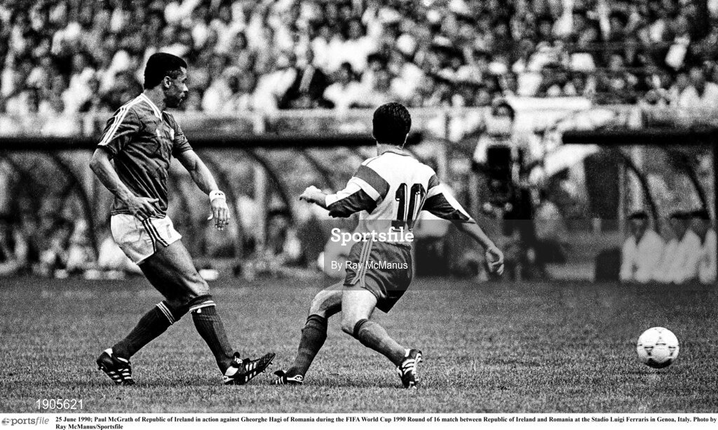 25 June 1990; Paul McGrath of Republic of Ireland in action against Gheorghe Hagi of Romania during the FIFA World Cup 1990 Round of 16 match between Republic of Ireland and Romania at the Stadio Luigi Ferraris in Genoa, Italy. Photo by Ray McManus/Sportsfile