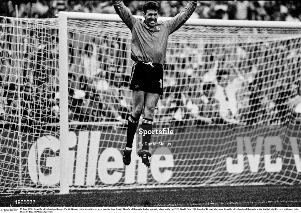25 June 1990; Republic of Ireland goalkeeper Packie Bonner celebrates after saving a penalty from Daniel Timofte of Romania during a penalty shoot out in the FIFA World Cup 1990 Round of 16 match between Republic of Ireland and Romania at the Stadio Luigi Ferraris in Genoa, Italy. Photo by Ray McManus/Sportsfile