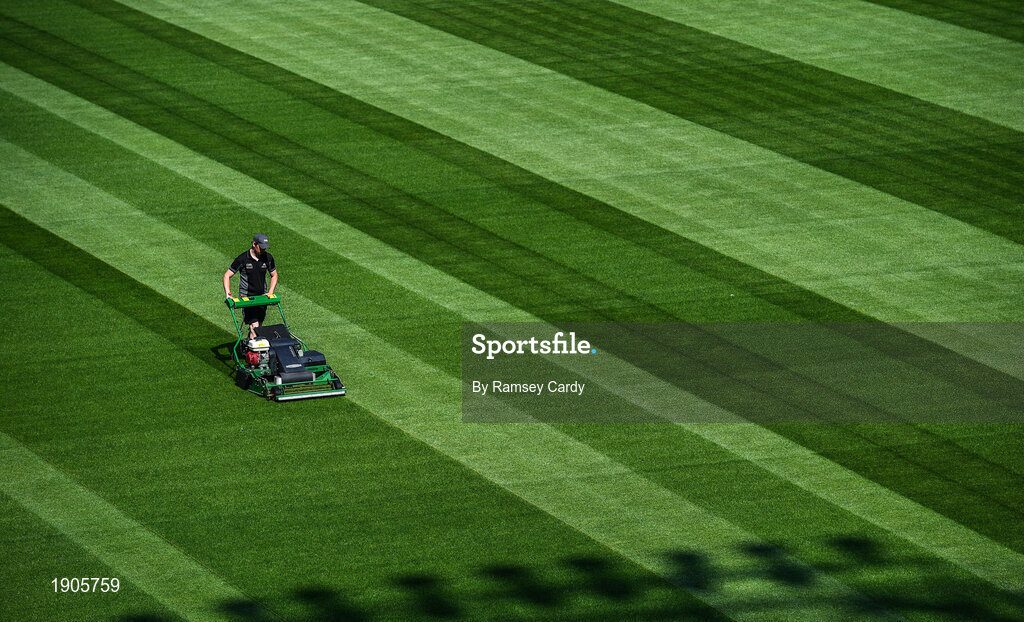 26 June 2020; Croke Park's groundsman Colm Daly cuts the pitch at Croke Park in Dublin. The GAA announced that inter-county fixtures will resume on October 17. Following approval from the GAA and the Irish Government, the GAA released its safe return to play protocols, allowing pitches to be opened for training and challenge games from 29 June. On March 25, the GAA announced the cessation of all GAA activities and closures of all GAA facilities under their jurisdiction upon directives from the Irish Government in an effort to contain the Coronavirus (COVID-19) pandemic. Photo by Ramsey Cardy/Sportsfile