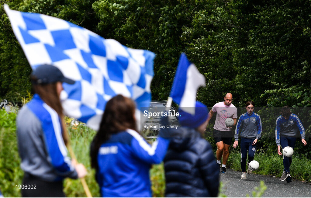 28 June 2020; Rory O'Connor of Rory Stories with members of Skryne GAA Club during the Solo For Livie Challenge in Ballymagarvey, Meath. The fundraising event is in support of 9 month old Livie Mulhern, from Balrath in Meath. Livie has been diagnosed with a rare and serious genetic neuromuscular condition called spinal muscular atrophy (SMA) type 1. SMA is caused by a gene deletion which results in deterioration of Livie’s nerve cells connecting her brain and spinal cord to her body’s muscles. The money raised from the event will be put towards a once-off gene therapy called Zolgensma, which is currently only available in the USA. It is the worlds most expensive treatment at a cost of $2,100,000. Photo by Ramsey Cardy/Sportsfile