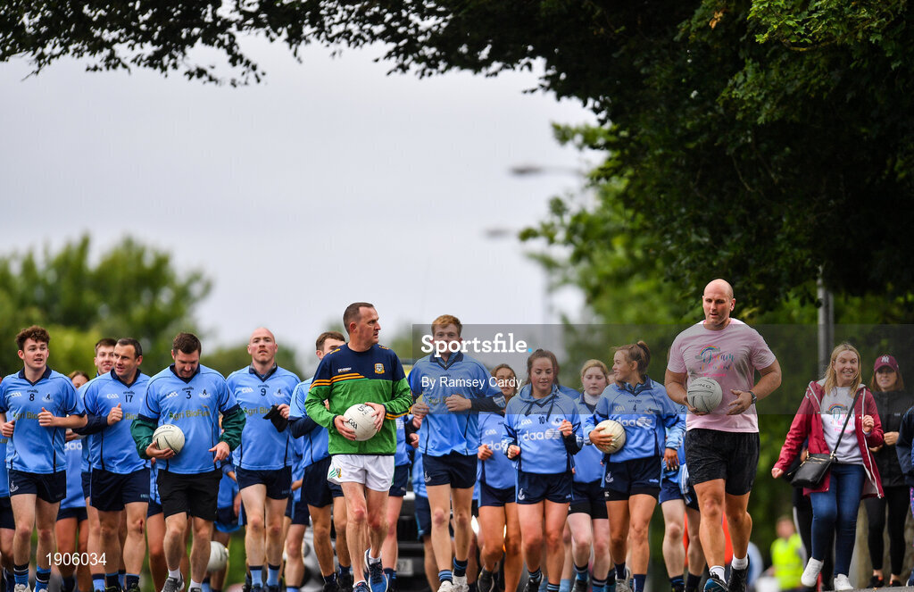 28 June 2020; Rory O'Connor of Rory Stories and Meath football manager Andy McEntee, left, with members of Garristown GAA Club during the Solo For Livie Challenge in Garristown, Meath. The fundraising event is in support of 9 month old Livie Mulhern, from Balrath in Meath. Livie has been diagnosed with a rare and serious genetic neuromuscular condition called spinal muscular atrophy (SMA) type 1. SMA is caused by a gene deletion which results in deterioration of Livie’s nerve cells connecting her brain and spinal cord to her body’s muscles. The money raised from the event will be put towards a once-off gene therapy called Zolgensma, which is currently only available in the USA. It is the worlds most expensive treatment at a cost of $2,100,000. Photo by Ramsey Cardy/Sportsfile