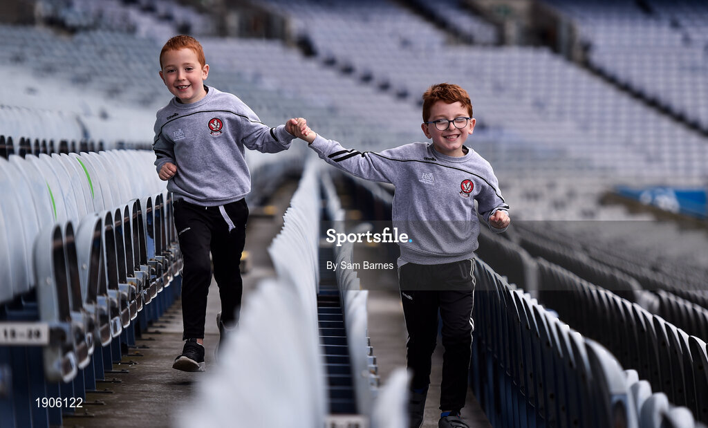 29 June 2020; Twins Thomas, right, and Daniel Gribbin, aged 7 from Castledawson in Derry celebrate the reopening of the GAA Museum and Tours at Croke Park. The inspiring Stadium Tour, thrilling Skyline Tour and treasured GAA Museum are now open to the public. With the GAA All-Ireland Senior Championships postponed until October, this is your only chance to visit Croke Park this summer, making them this season’s hottest tickets! For more see www.crokepark.ie/tours Photo by Sam Barnes/Sportsfile