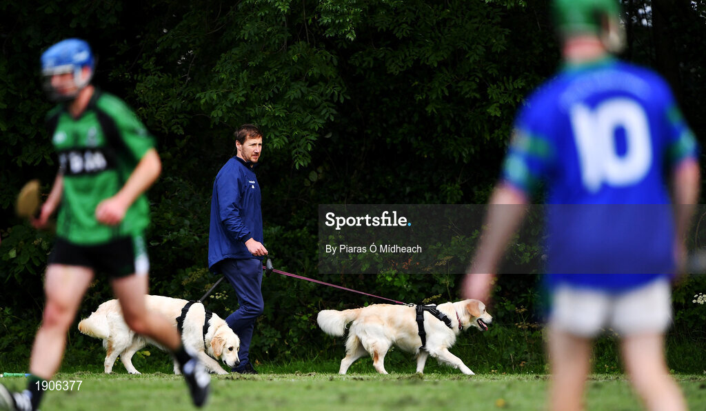 30 June 2020; A man walks his dogs past the action during the Junior B Hurling Challenge game between St Sylvester's and St Patrick's Donabate at Malahide Castle Pitches in Dublin. Photo by Piaras Ó Mídheach/Sportsfile