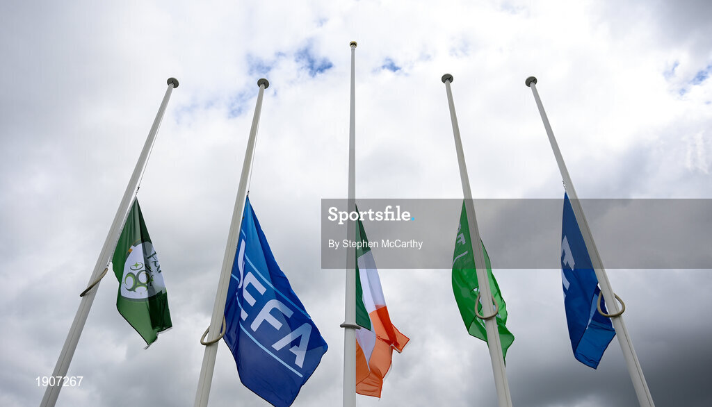 11 July 2020; Flags are flown at half-mast outside the FAI Headquarters in Abbotstown, Dublin, as a mark of respect to the passing of former Republic of Ireland manager Jack Charlton, who lead the Republic of Ireland team to their first major finals at UEFA Euro 1988, and subsequently the FIFA World Cup 1990, in Italy, and the FIFA World Cup 1994, in USA. Photo by Stephen McCarthy/Sportsfile