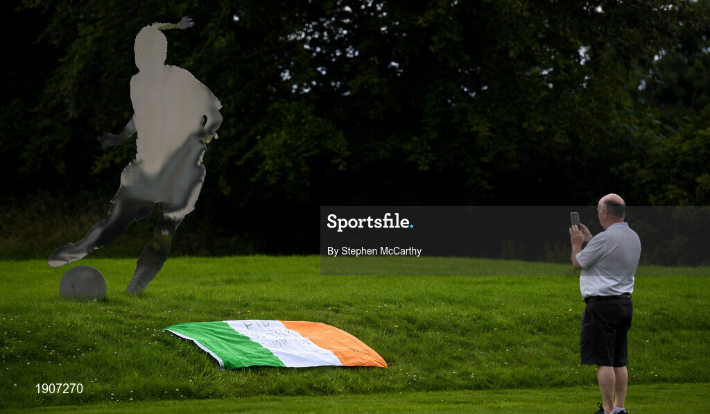 11 July 2020; A member of the public photographs a tribute that is placed outside the FAI Headquarters in Abbotstown, Dublin, as a mark of respect to the passing of former Republic of Ireland manager Jack Charlton, who lead the Republic of Ireland team to their first major finals at UEFA Euro 1988, and subsequently the FIFA World Cup 1990, in Italy, and the FIFA World Cup 1994, in USA. Photo by Stephen McCarthy/Sportsfile