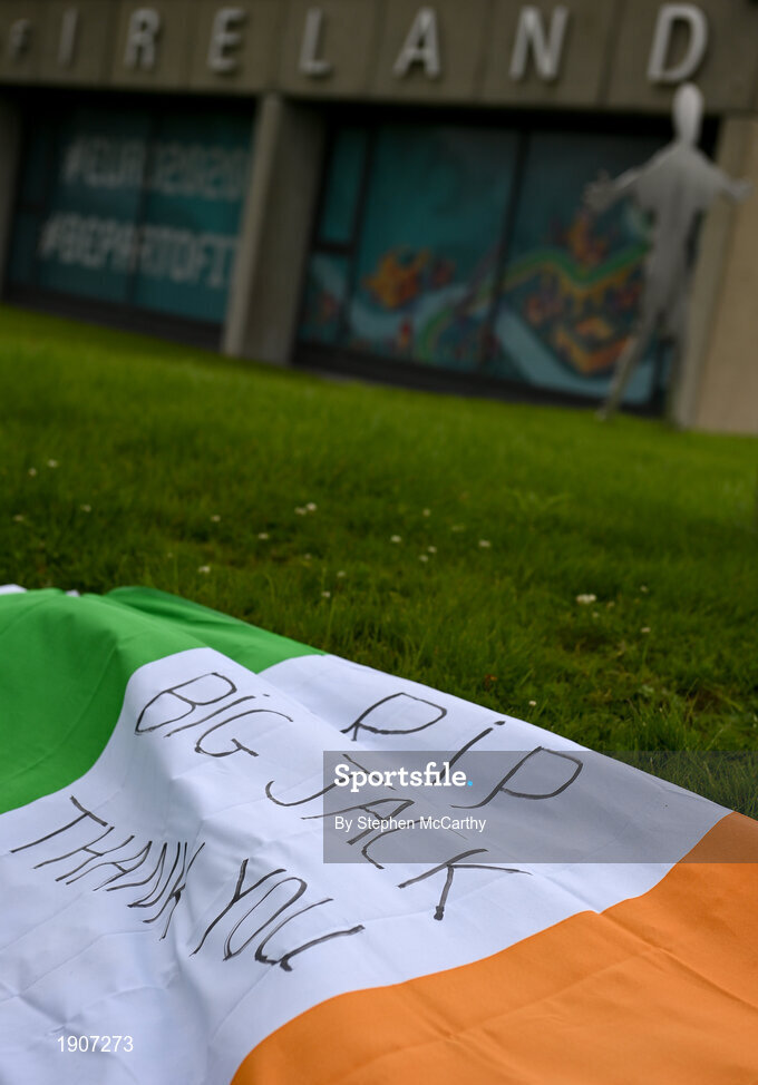 11 July 2020; A tribute is placed outside the FAI Headquarters in Abbotstown, Dublin, as a mark of respect to the passing of former Republic of Ireland manager Jack Charlton, who lead the Republic of Ireland team to their first major finals at UEFA Euro 1988, and subsequently the FIFA World Cup 1990, in Italy, and the FIFA World Cup 1994, in USA. Photo by Stephen McCarthy/Sportsfile