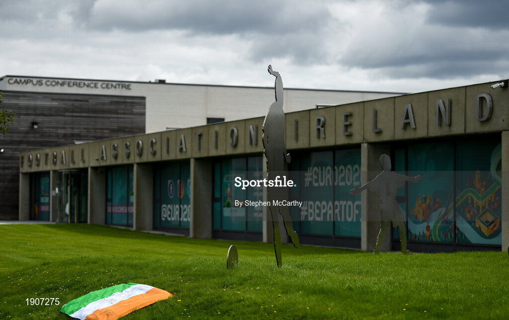 11 July 2020; A tribute is placed outside the FAI Headquarters in Abbotstown, Dublin, as a mark of respect to the passing of former Republic of Ireland manager Jack Charlton, who lead the Republic of Ireland team to their first major finals at UEFA Euro 1988, and subsequently the FIFA World Cup 1990, in Italy, and the FIFA World Cup 1994, in USA. Photo by Stephen McCarthy/Sportsfile