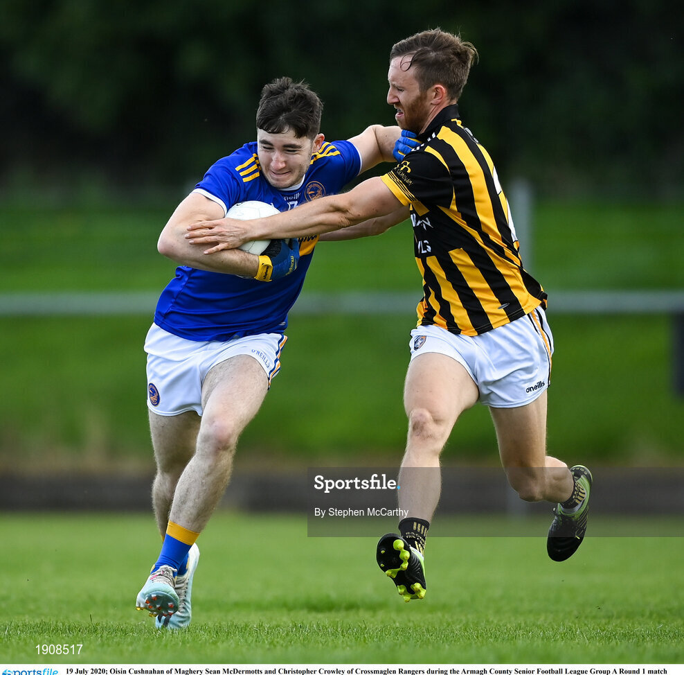 19 July 2020; Oisin Cushnahan of Maghery Sean McDermotts and Christopher Crowley of Crossmaglen Rangers during the Armagh County Senior Football League Group A Round 1 match between Maghery Sean McDermotts and Crossmaglen Rangers at Felix Hamill Park in Maghery, Armagh. Competitive GAA matches have been approved to return following the guidelines of Northern Ireland’s COVID-19 recovery plan and protocols set down by the GAA governing authorities. With games having been suspended since March, competitive games can take place with updated protocols with only players, officials and essential personnel permitted to attend, social distancing, hand sanitisation and face masks being worn by those in attendance in an effort to contain the spread of the Coronavirus (COVID-19) pandemic. Photo by Stephen McCarthy/Sportsfile