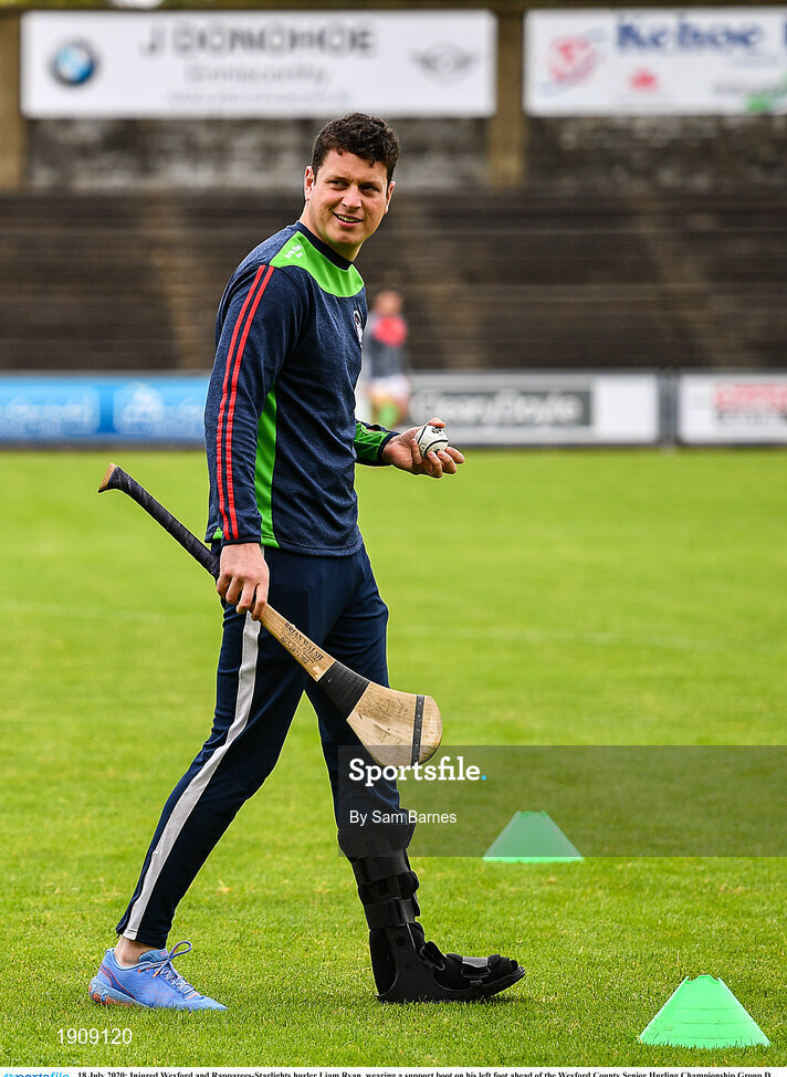 18 July 2020; Injured Wexford and Rapparees-Starlights hurler Liam Ryan, wearing a support boot on his left foot ahead of the Wexford County Senior Hurling Championship Group D Round 1 match between Rapparees-Starlights and Shelmaliers at Chadwicks Wexford Park in Wexford. Competitive GAA matches have been approved to return following the guidelines of Phase 3 of the Irish Government’s Roadmap for Reopening of Society and Business and protocols set down by the GAA governing authorities. With games having been suspended since March, competitive games can take place with updated protocols including a limit of 200 individuals at any one outdoor event, including players, officials and a limited number of spectators, with social distancing, hand sanitisation and face masks being worn by those in attendance among other measures in an effort to contain the spread of the Coronavirus (COVID-19) pandemic. Photo by Sam Barnes/Sportsfile