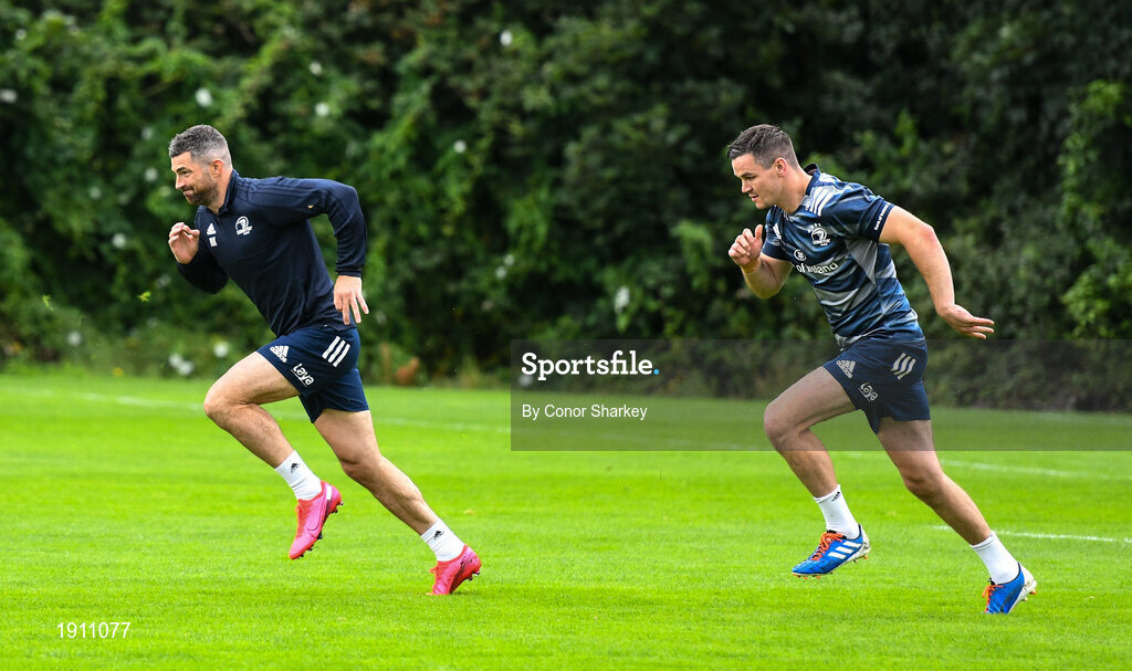 30 July 2020; Jonathan Sexton, right, and Rob Kearney during Leinster Rugby squad training at UCD in Dublin. Professional rugby continues its return in a phased manner, having been suspended since March due to the Irish Government's efforts to contain the spread of the Coronavirus (COVID-19) pandemic. Having had zero positive results from the latest round of PCR testing, the Leinster Rugby players and staff have been cleared to enter the next phase of their return to rugby today which includes a graduated return to contact training. Photo by Conor Sharkey for Leinster Rugby via Sportsfile