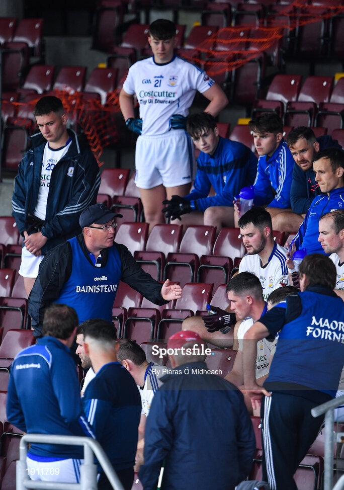 1 August 2020; Mícheál Breathnach's manager Paraic Ó Coirbín talks to his players in the stand at half-time during the Galway County Senior Football Championship Group 2 Round 1 match between Moycullen and Mícheál Breathnach's at Pearse Stadium in Galway. GAA matches continue to take place in front of a limited number of people in an effort to contain the spread of the Coronavirus (COVID-19) pandemic. Photo by Piaras Ó Mídheach/Sportsfile