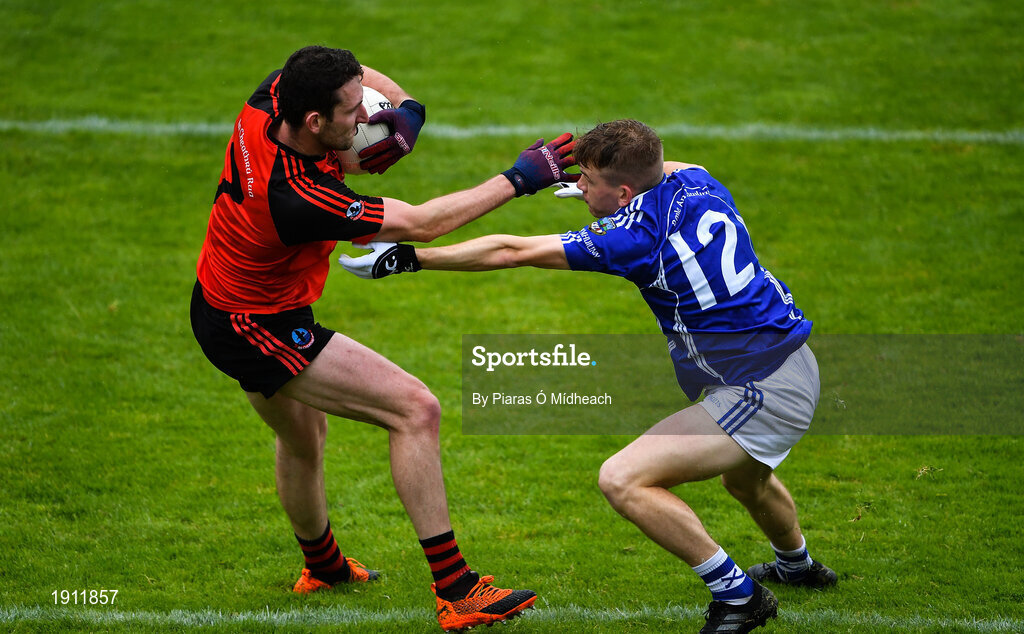 1 August 2020; Coilín Ó Domhnaill of An Cheathrú Rua is tackled by Liam Costello of Milltown during the Galway County Senior Football Championship Group 4B Round 1 match between An Cheathrú Rua and Milltown at Pearse Stadium in Galway. GAA matches continue to take place in front of a limited number of people in an effort to contain the spread of the Coronavirus (COVID-19) pandemic. Photo by Piaras Ó Mídheach/Sportsfile