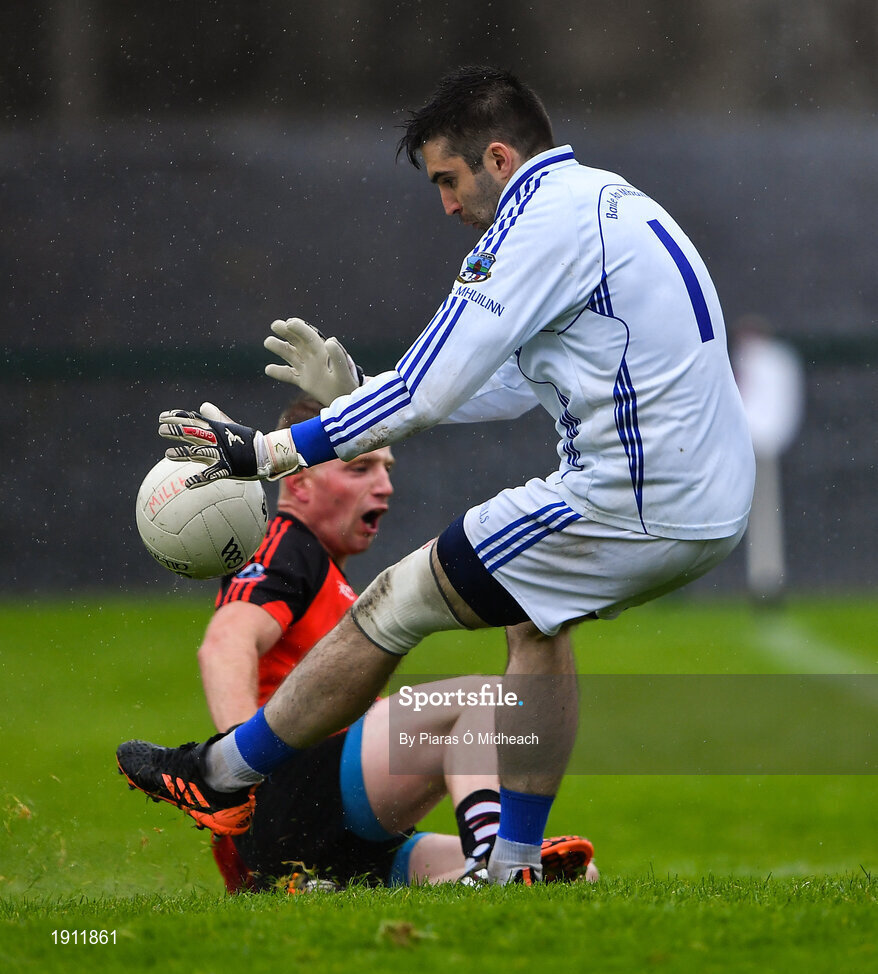 1 August 2020; Milltown goalkeeper Conor Nolan saves a shot on goal from Paudi MacCormac of An Cheathrú Rua, behind, during the Galway County Senior Football Championship Group 4B Round 1 match between An Cheathrú Rua and Milltown at Pearse Stadium in Galway. GAA matches continue to take place in front of a limited number of people in an effort to contain the spread of the Coronavirus (COVID-19) pandemic. Photo by Piaras Ó Mídheach/Sportsfile