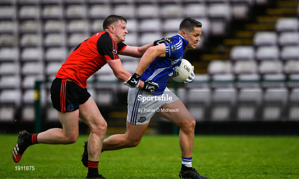 1 August 2020; Mark Hehir of Milltown in action against Iarfhlaith Ó Conchubhair of An Cheathrú Rua during the Galway County Senior Football Championship Group 4B Round 1 match between An Cheathrú Rua and Milltown at Pearse Stadium in Galway. GAA matches continue to take place in front of a limited number of people in an effort to contain the spread of the Coronavirus (COVID-19) pandemic. Photo by Piaras Ó Mídheach/Sportsfile