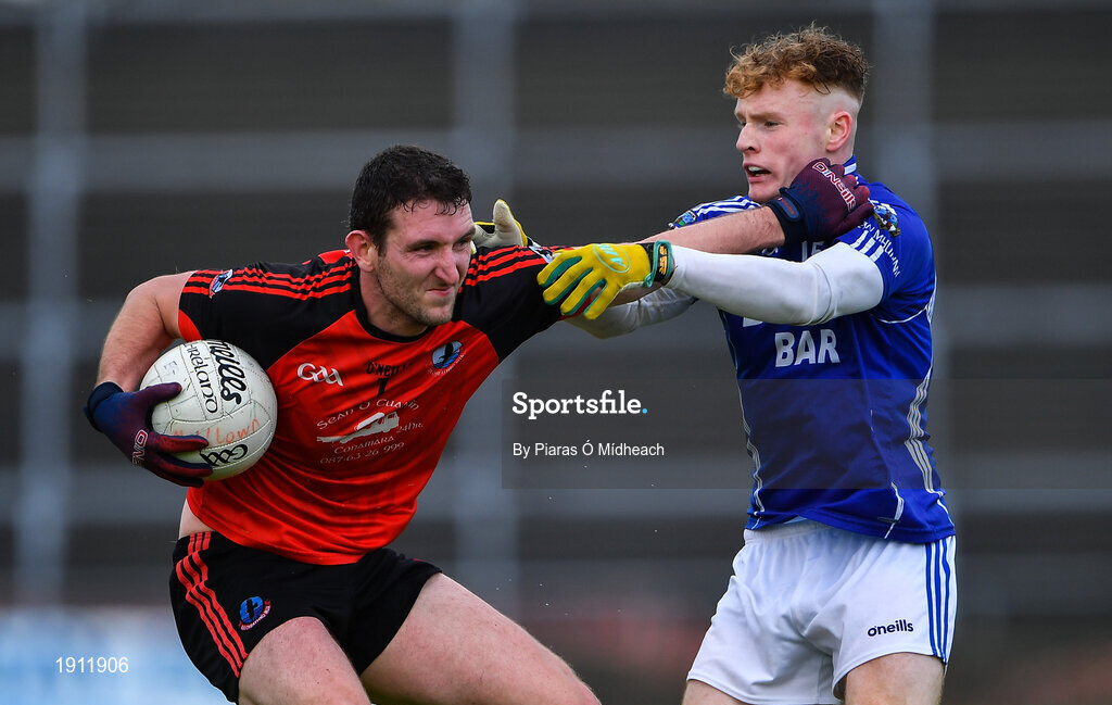 1 August 2020; Colín Ó Domhnaill of An Cheathrú Rua in action against Cullen McDonagh of Milltown during the Galway County Senior Football Championship Group 4B Round 1 match between An Cheathrú Rua and Milltown at Pearse Stadium in Galway. GAA matches continue to take place in front of a limited number of people in an effort to contain the spread of the Coronavirus (COVID-19) pandemic. Photo by Piaras Ó Mídheach/Sportsfile