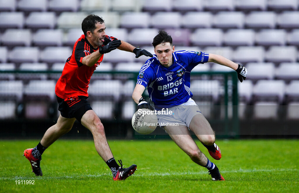 1 August 2020; Eoin Mannion of Milltown in action against Antaine Ó Conghaile of An Cheathrú Ruaduring the Galway County Senior Football Championship Group 4B Round 1 match between An Cheathrú Rua and Milltown at Pearse Stadium in Galway. GAA matches continue to take place in front of a limited number of people in an effort to contain the spread of the Coronavirus (COVID-19) pandemic. Photo by Piaras Ó Mídheach/Sportsfile