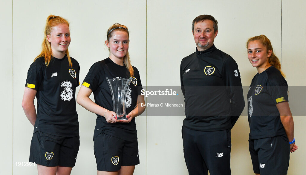 4 August 2020; U15's award winner Jessie Stapleton with her award alongside nominees Aoife Cronin, left, and Ellen Molloy, right, with Richard Berkeley, U15 Schools Head Coach, during the 3 FAI International Awards Underage Winner presentation at Woodlands Hotel in Waterford. Photo by Piaras Ó Mídheach/Sportsfile