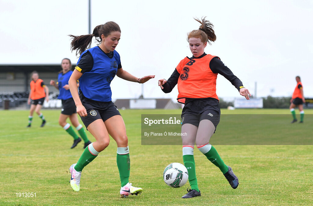 4 August 2020; Chloe McCarthy, right, and Rebecca Watkins during Republic of Ireland Women's Under-17 Training Camp at Tramore AFC in Waterford. Photo by Piaras Ó Mídheach/Sportsfile