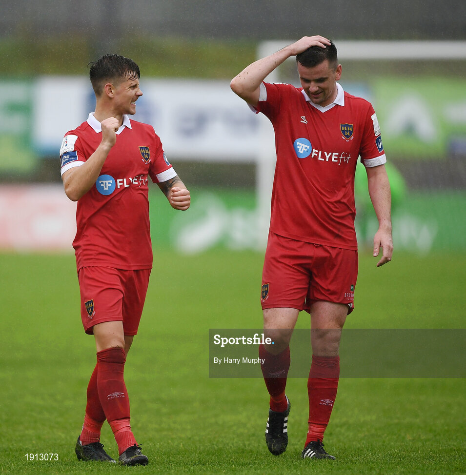 4 August 2020; Luke Byrne, left, and Dan Byrne of Shelbourne celebrate following the SSE Airtricity League Premier Division match between Finn Harps and Shelbourne at Finn Park in Ballybofey, Donegal. Photo by Harry Murphy/Sportsfile