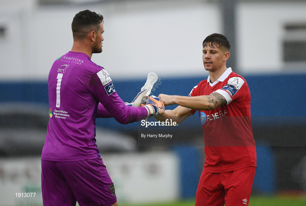 4 August 2020; Luke Byrne, right, and Colin McCabe of Shelbourne celebrate following the SSE Airtricity League Premier Division match between Finn Harps and Shelbourne at Finn Park in Ballybofey, Donegal. Photo by Harry Murphy/Sportsfile