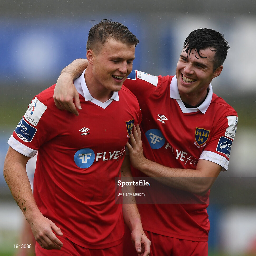 4 August 2020; Daniel O’Reilly, left, and Alex O’Hanlon of Shelbourne celebrate following the SSE Airtricity League Premier Division match between Finn Harps and Shelbourne at Finn Park in Ballybofey, Donegal. Photo by Harry Murphy/Sportsfile