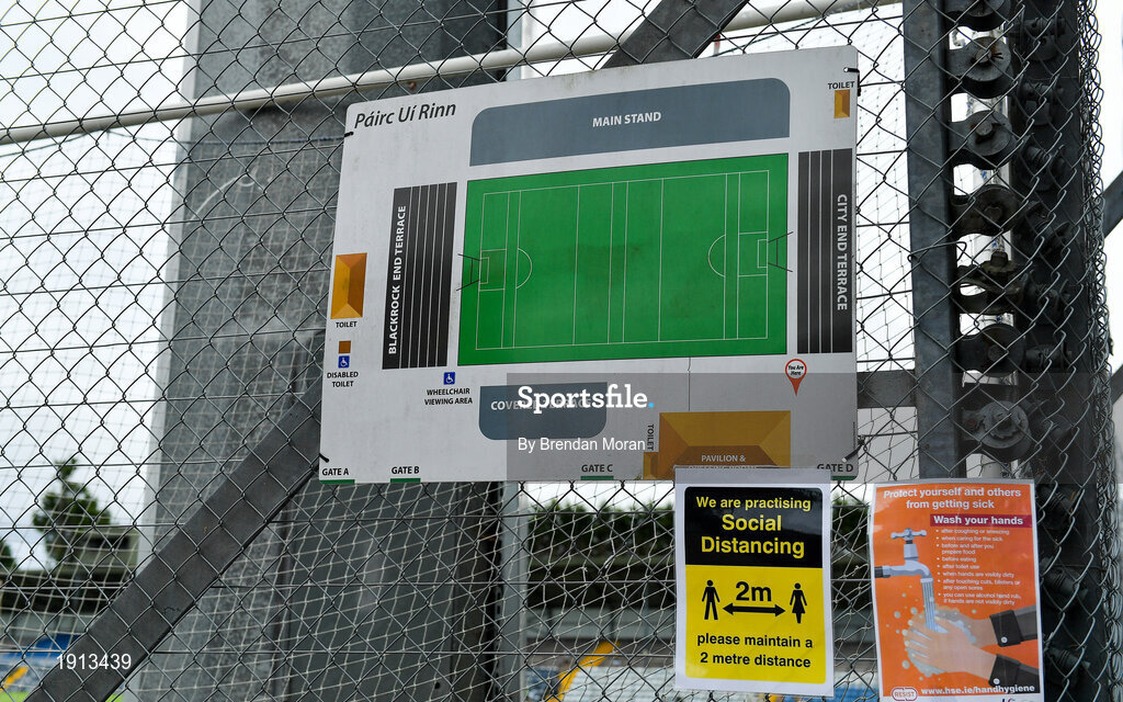 1 August 2020; Coronavirus signage is seen prior to the Cork County Senior Hurling Championship Group B Round 1 match between Blackrock and Erin's Own at Páirc Uí Chaoimh in Cork. GAA matches continue to take place in front of a limited number of people due to the ongoing Coronavirus restrictions. Photo by Brendan Moran/Sportsfile