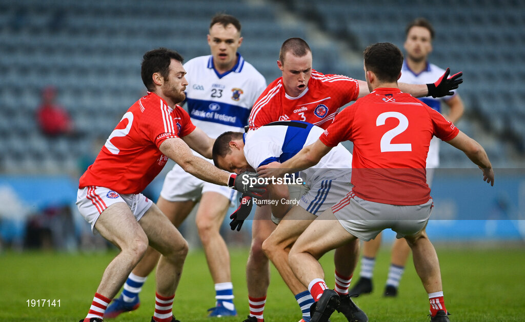 15 August 2020; Tómas Quinn of St Vincent's in action against Brian Berney, left, Conor Doran and Liam Howley of Clontarf during the Dublin County Senior 1 Football Championship Group 3 Round 3 match between Clontarf and St. Vincent's at Parnell Park in Dublin. Photo by Ramsey Cardy/Sportsfile