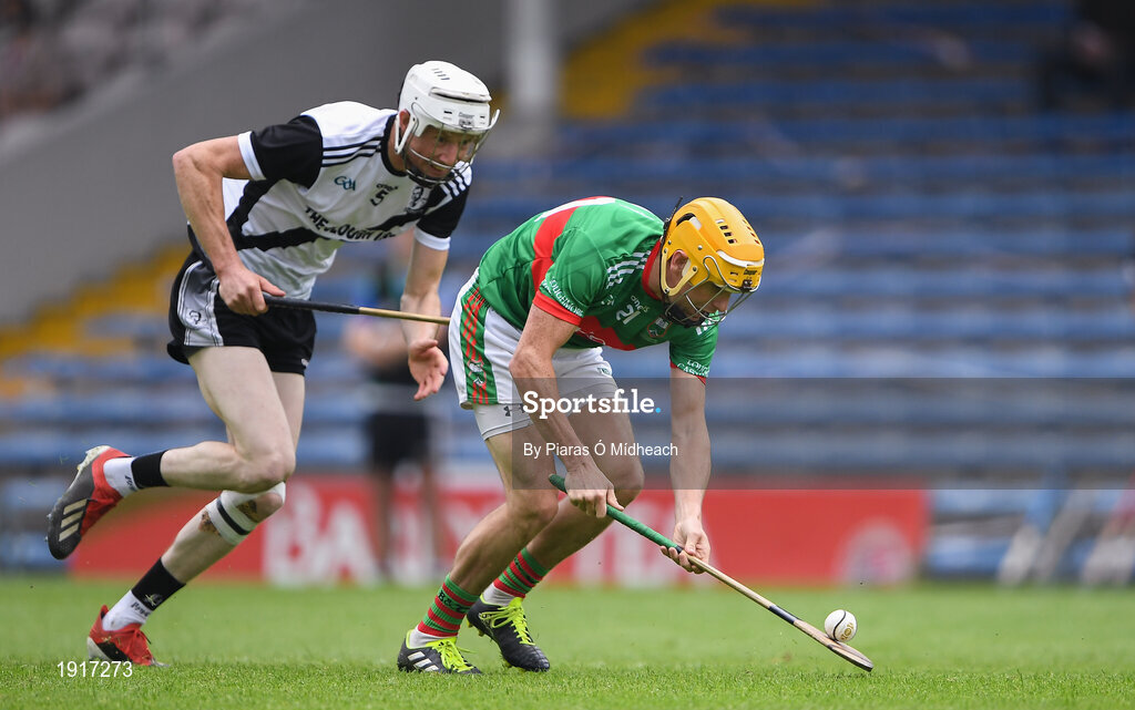 16 August 2020; Evan Sweeney of Loughmore-Castleiney lifts the ball as Willie Cleary of Kilruane MacDonagh's closes in during the Tipperary County Senior Hurling Championship Group 3 Round 3 match between Kilruane McDonagh's and Loughmore Castleiney at Semple Stadium in Thurles, Tipperary. Photo by Piaras Ó Mídheach/Sportsfile