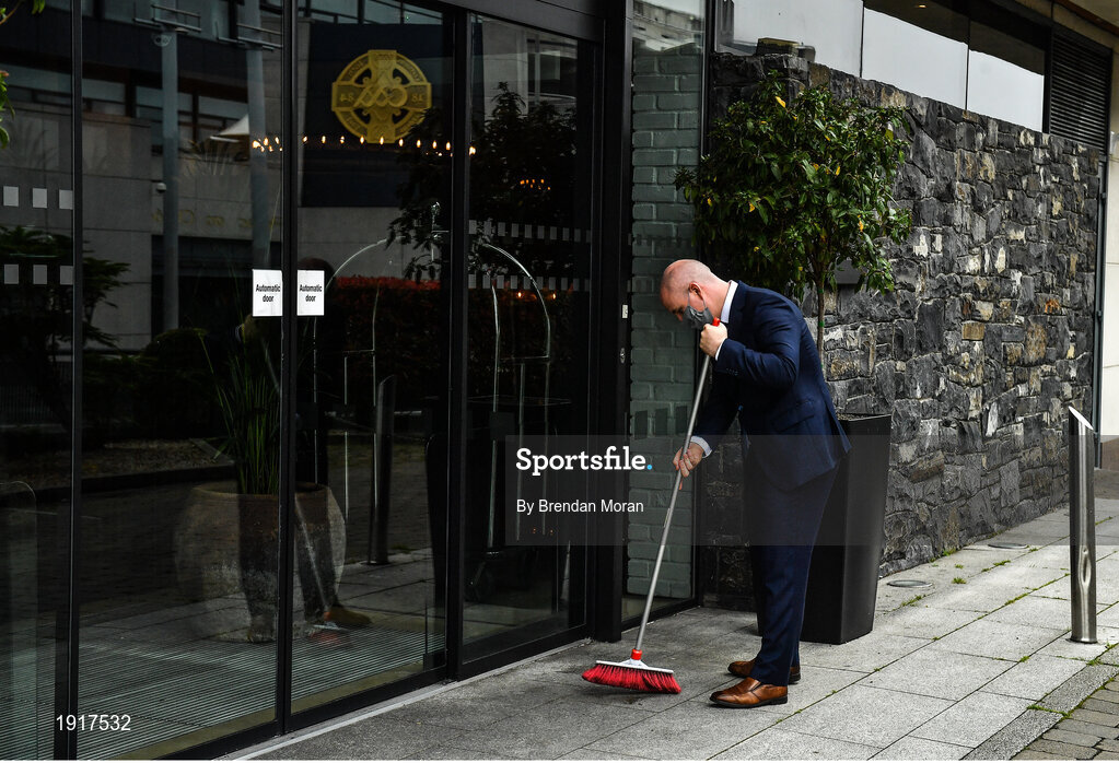 16 August 2020; The Croke Park Hotel general manager Alan Smullen sweeps up outside the door of his hotel on the original scheduled date of the 2020 GAA Hurling All-Ireland Senior Championship Final. Due to current restrictions laid down by the Irish government to prevent the spread of coronavirus, the dates for the staging of the GAA inter-county season have been pushed back, with the first round of games now due to start in October. The 2020 All-Ireland Senior Hurling Championship was due to be the 133rd staging of the All-Ireland Senior Hurling Championship, the Gaelic Athletic Association's premier inter-county hurling tournament, since its establishment in 1887. For the first time in 96 years the All-Ireland hurling final is now due to be played in December with the 2020 final due on Sunday, December 13th, the same weekend on which Dublin beat Galway in the 1924 final. Photo by Brendan Moran/Sportsfile