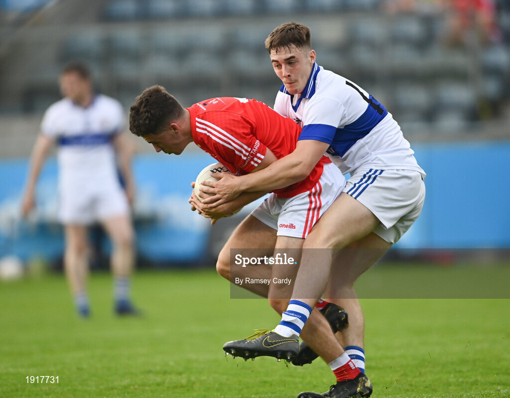 15 August 2020; Fergal O'Byrne of Clontarf is tackled by Sean Lowry of St Vincent's during the Dublin County Senior 1 Football Championship Group 3 Round 3 match between Clontarf and St. Vincent's at Parnell Park in Dublin. Photo by Ramsey Cardy/Sportsfile