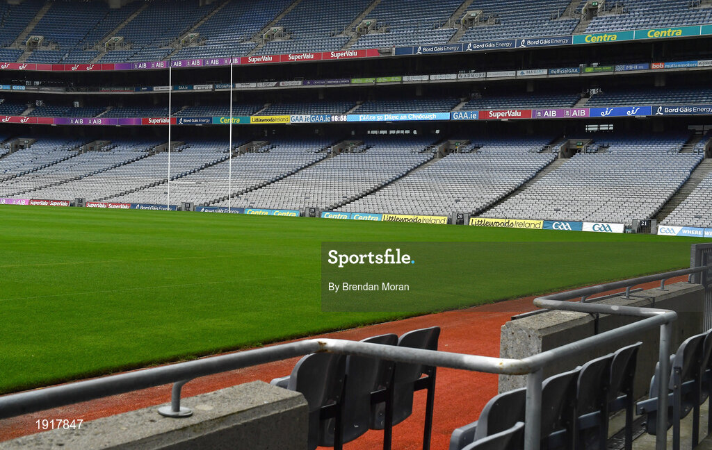 16 August 2020; The view from behind team management seats at 4.58pm in an empty Croke Park Stadium on the original scheduled date of the 2020 GAA Hurling All-Ireland Senior Championship Final. Due to current restrictions laid down by the Irish government to prevent the spread of coronavirus, the dates for the staging of the GAA inter-county season have been pushed back, with the first round of games now due to start in October. The 2020 All-Ireland Senior Hurling Championship was due to be the 133rd staging of the All-Ireland Senior Hurling Championship, the Gaelic Athletic Association's premier inter-county hurling tournament, since its establishment in 1887. For the first time in 96 years the All-Ireland hurling final is now due to be played in December with the 2020 final due on Sunday, December 13th, the same weekend on which Dublin beat Galway in the 1924 final. Photo by Brendan Moran/Sportsfile